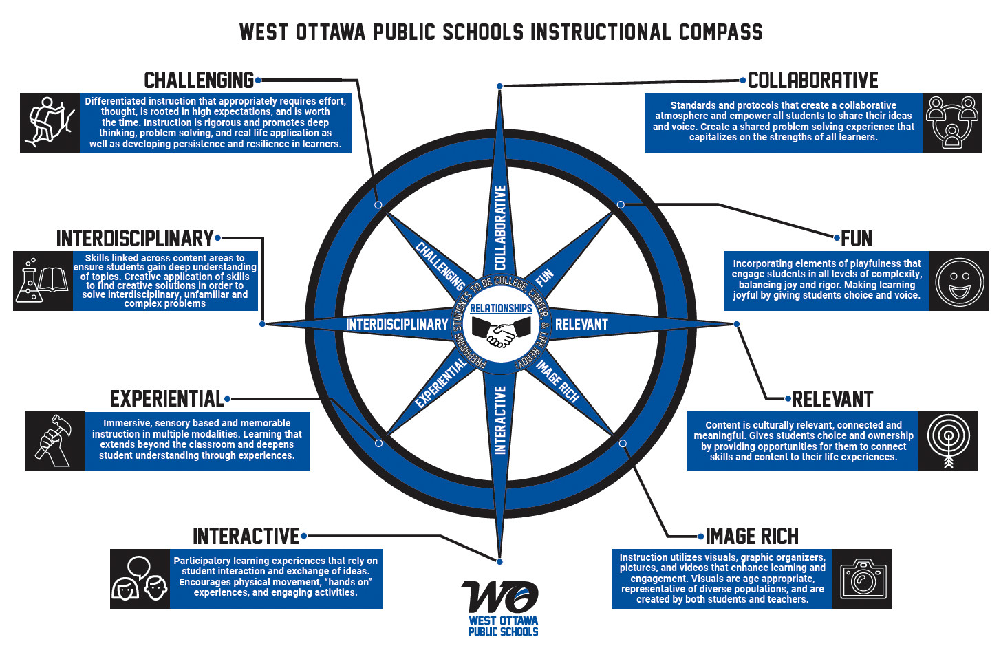 The Inauguration of West Ottawa’s Instructional Compass took place at the beginning of the 2023-24 academic year. This strategic framework was devised as a valuable instrument to steer and enhance the implementation of effective teaching and learning methodologies across our entire educational district.